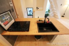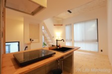 キッチンはブロックを積み上げたオリジナルの造作の対面カウンター式です。コンロも3口タイプ(IH)となっていますので、調理も楽しんでいただくことができますし、お料理をそのままカウンターでお食事していただくことも可能で暮らしやすいデザインとなっています。