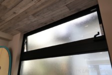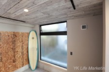 リビングの天井高は約4mの吹き抜けのある勾配天井となっており、床まで伸びた大きな窓とあいまって、明るく開放的な空間が広がります。この天井にはシーリングファンが装備されていますので逗子の自然の風を感じて快適に過ごしていただけます。