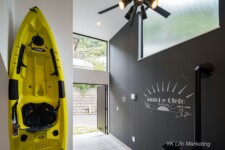 開放的な土間ガレージには、ゆらりと揺れる炎を楽しむペレットストーブがあり、温もりに包まれた空間となっています。