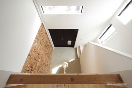 1階に土間と水回り、2階にリビング、1.5階にレストルームにも活用できるロフト、2.5階には収納ロフトがある広いスペースが特徴のメゾネットタイプ。