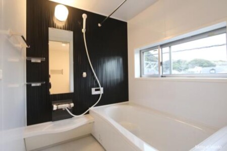 キッチンは、大型2,100mmサイズ。3口のIHコンロを完備しています。バスは1坪サイズ(1616)で、足を伸ばしてゆっくりと入浴できます。また浴室の窓には逗子の山並みが広がり、夕日を眺めて入浴を楽しんで頂けます。浴室乾燥機も完備。