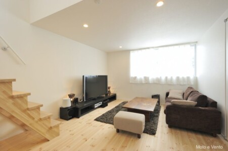 リビングには高さ3.mの大型の高窓付き吹き抜けがあり、高窓の先には湘南の空が広がります。