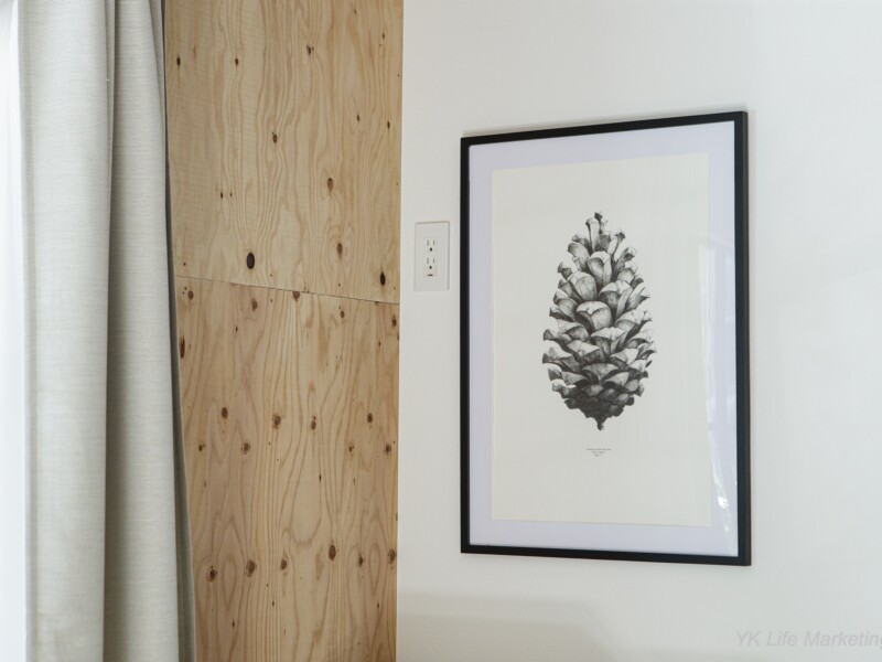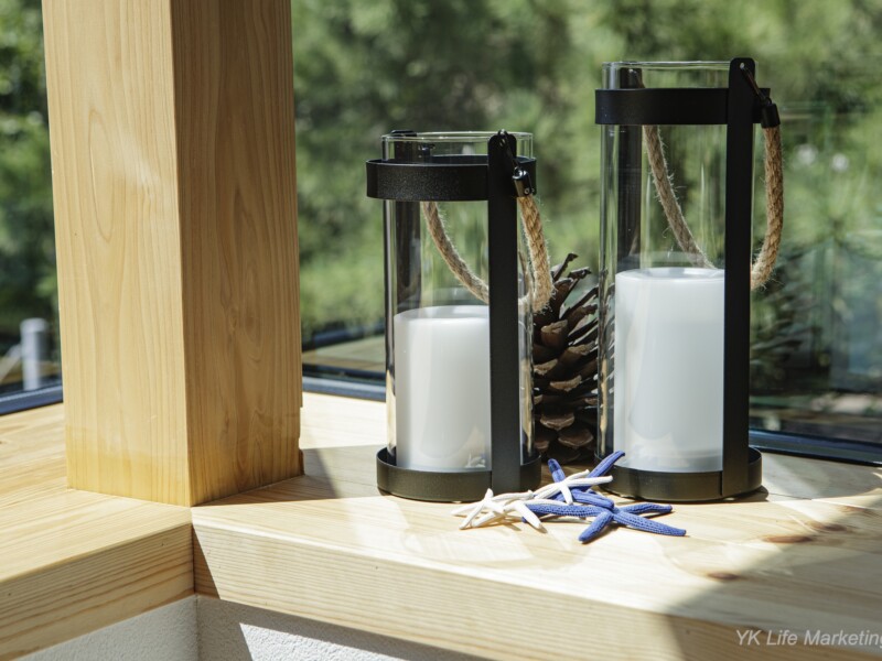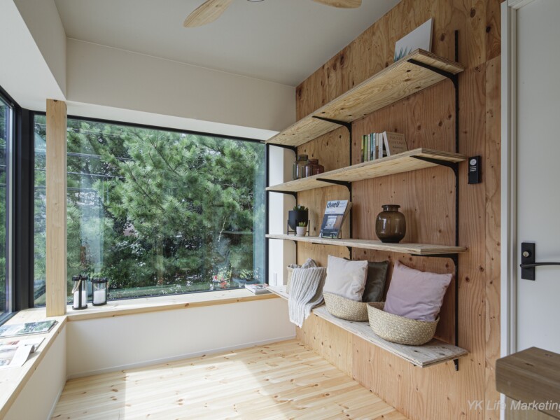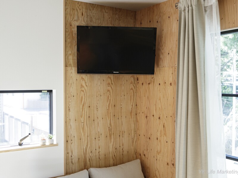 朝の砂浜を思わせるライトグレーの天井に、木の表情豊かなパイン無垢床とラーチ材の壁。開放的な大窓からたっぷり光が入り、逗子の自然の延長に居るような心地よさです。