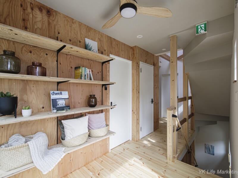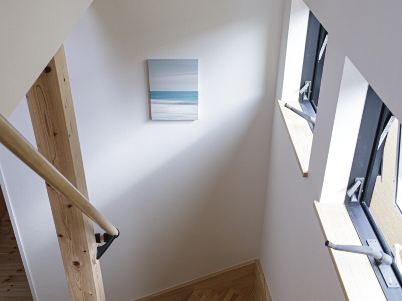 2階階段ホールにあるマリンビューリビングは、海、空、街、住人がつながるシームレスな空間。